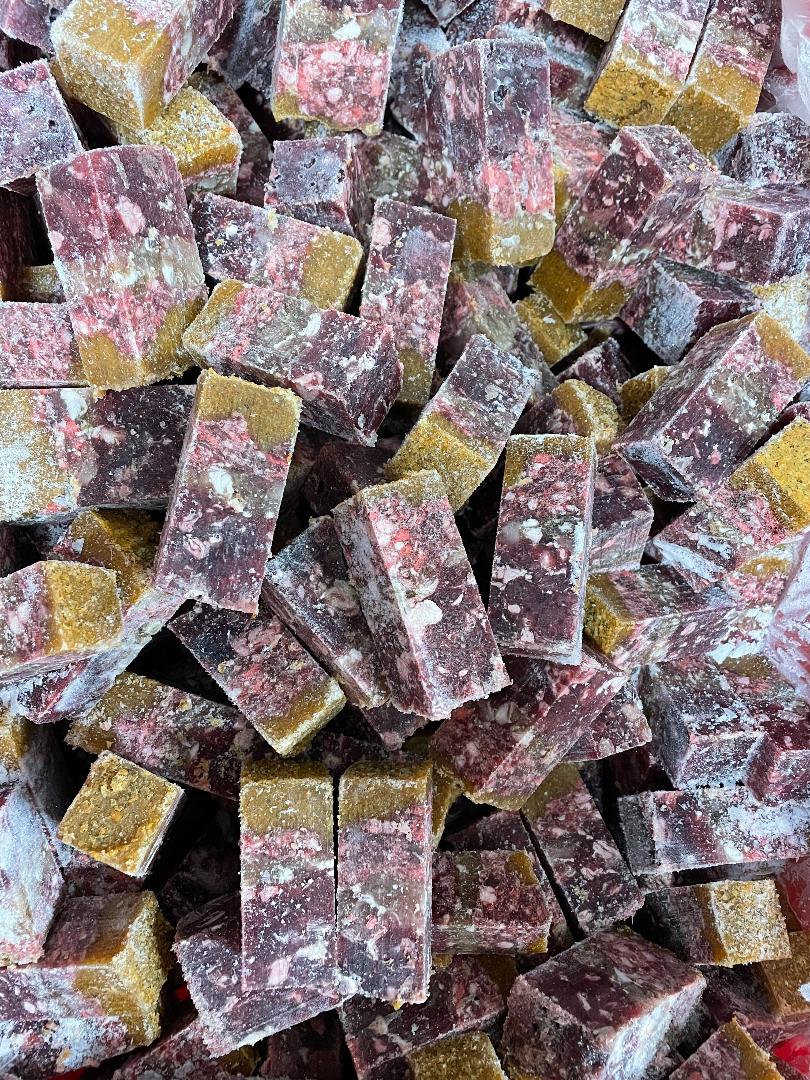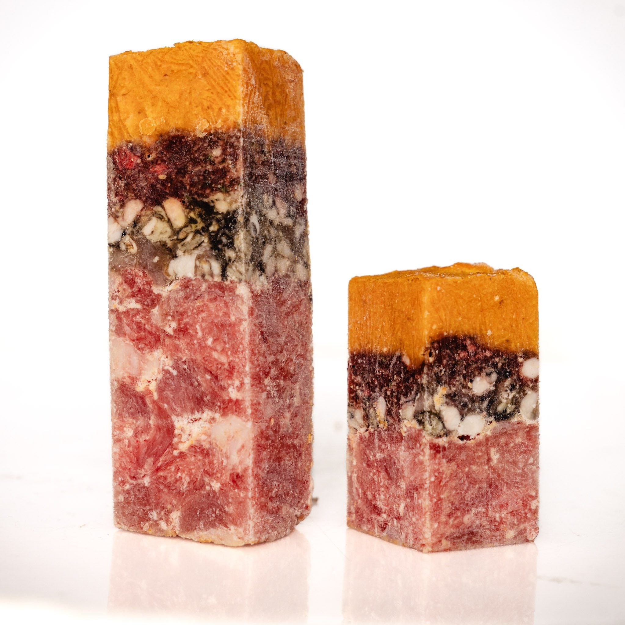 Die unterschiedlichen Schichten des Würfels geben einen Querschnitt der Bestandteile unserer Menüs gut sichtbar wieder. Einfach portionierbar erhält dein Hund mit jedem Würfel von allen Zutaten den richtigen Anteil.